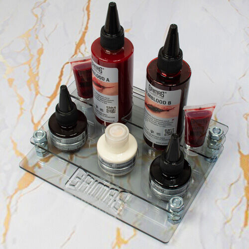 Expositor vacío de metacrilato para la presentación de los productos Grimas en el mostrador,