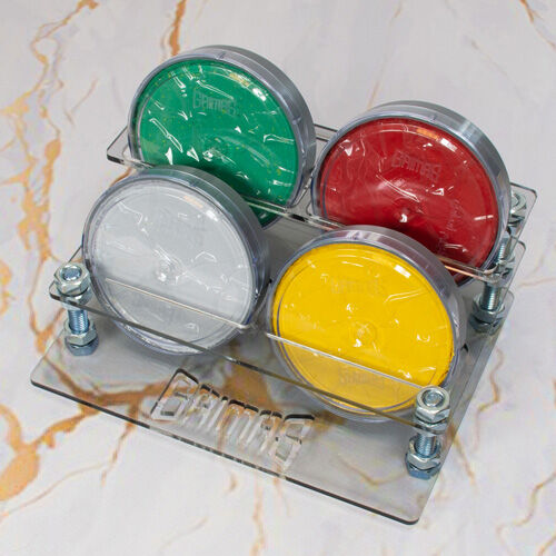Expositor vacío de metacrilato para la presentación de los productos Grimas en el mostrador,