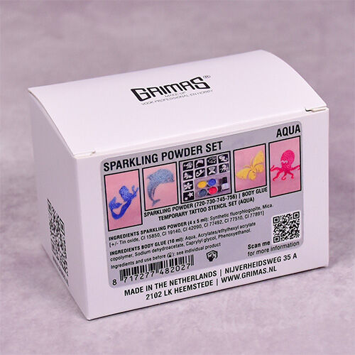 Grimas Sparkling Powder es un polvo fino altamente pigmentado con un gran brillo, Body Glue es un pegamento para la piel fuerte y duradero, adecuado para muchos propósitos.