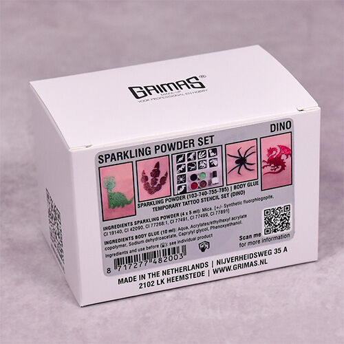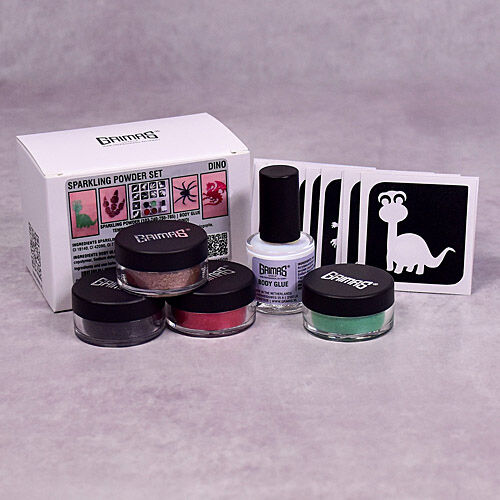 Grimas Sparkling Powder es un polvo fino altamente pigmentado con un gran brillo, Body Glue es un pegamento para la piel fuerte y duradero, adecuado para muchos propósitos.