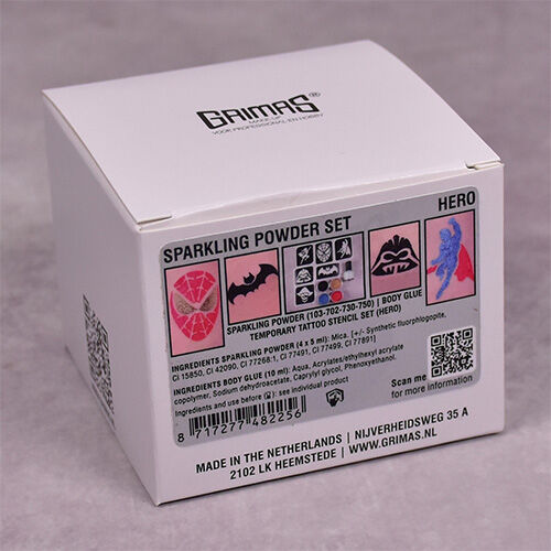 Grimas Sparkling Powder es un polvo fino altamente pigmentado con un gran brillo, Body Glue es un pegamento para la piel fuerte y duradero, adecuado para muchos propósitos.