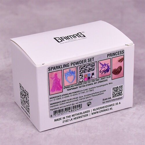 Grimas Sparkling Powder es un polvo fino altamente pigmentado con un gran brillo, Body Glue es un pegamento para la piel fuerte y duradero, adecuado para muchos propósitos.