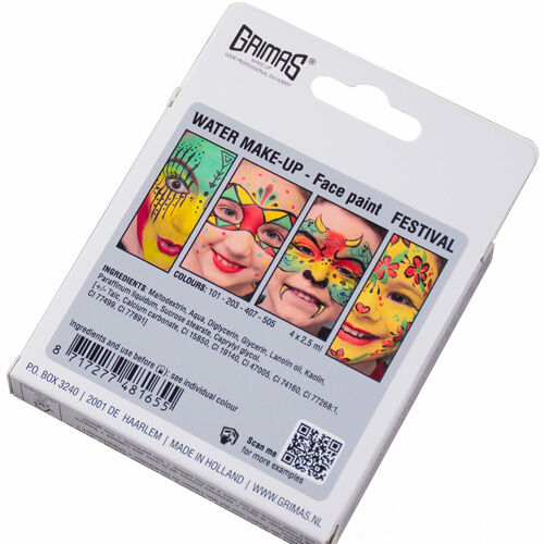 Estos alegres sets de pintura facial se componen de 4 colores de Water Make-up (2,5 ml). En el reverso de la caja hay 4 ejemplos de lo que se puede hacer con ella. Y si escaneas el código QR, inmediatamente terminarás con ideas aún más divertidas para pintar caras. ¿Estás buscando un regalo original para una fiesta infantil? Estos sets también son perfectos como regalo. El set FESTIVAL contiene los colores negro (101), amarillo (203), verde (407) y rojo (505). Estos colores son ideales para celebrar un carnaval colorido, pero por supuesto hay muchas más posibilidades festivas.